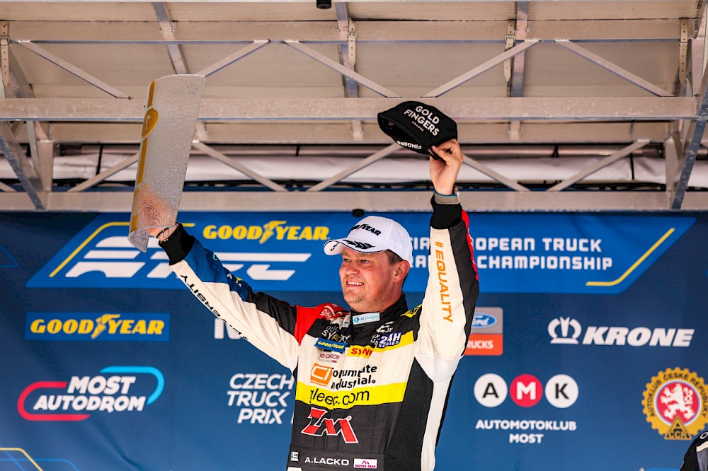 Vítězství ve druhé jízdě, druhé místo ve třetí. Adam Lacko při svém jednorázovém návratu do ME tahačů v Mostě ukázal, že závodění s pětitunovými monstry nezapomněl. Domácí fanoušky potěšil mimo jiné i v nepříznivém počasí.