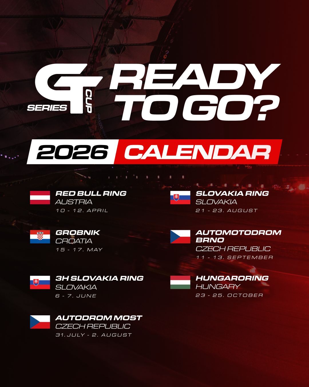 Kalendář pro rok 2026 přináší kombinaci tradičních podniků i návratů oblíbených tratí. Po úvodním podniku v Rakousku se série přesune na chorvatský Grobnik a následně na Slovakia Ring, kde se uskuteční tříhodinový vytrvalostní závod. Druhá polovina sezóny zavede startovní pole do Mostu, Brna a finále obstará návrat Hungaroringu.
